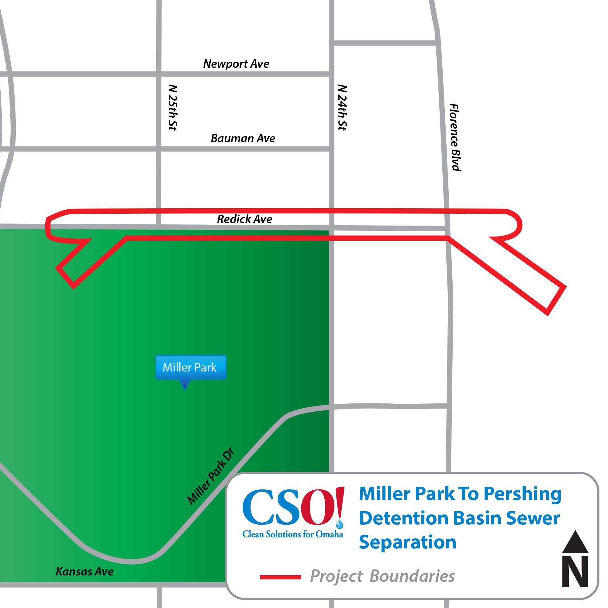 The Miller Park to Pershing Detention Basin Sewer Separation Project diverts already separated stormwater to the Pershing Detention Basin. This project included construction of approximately 2,300 feet of 60-inch stormwater conveyance sewer between the Miller Park Detention Pond and Pershing Detention Basin. Due to topography and utility conflicts, approximately half of the stormwater sewer pipe was installed using underground tunnel construction, known as microtunneling. Modifications to the existing Miller Park outlet structure and construction of a new inlet into the Pershing Detention Basin were also included in the project.